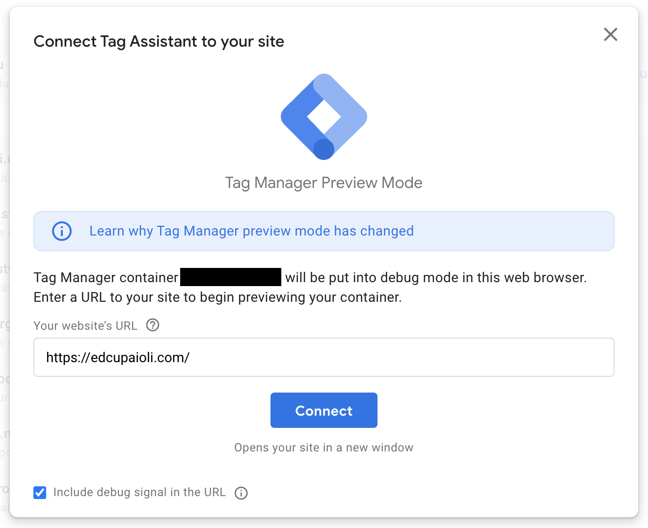3. Tag Manager will open a new window, for the Tag Assistant. Enter your website’s URL in the input then select Connect.