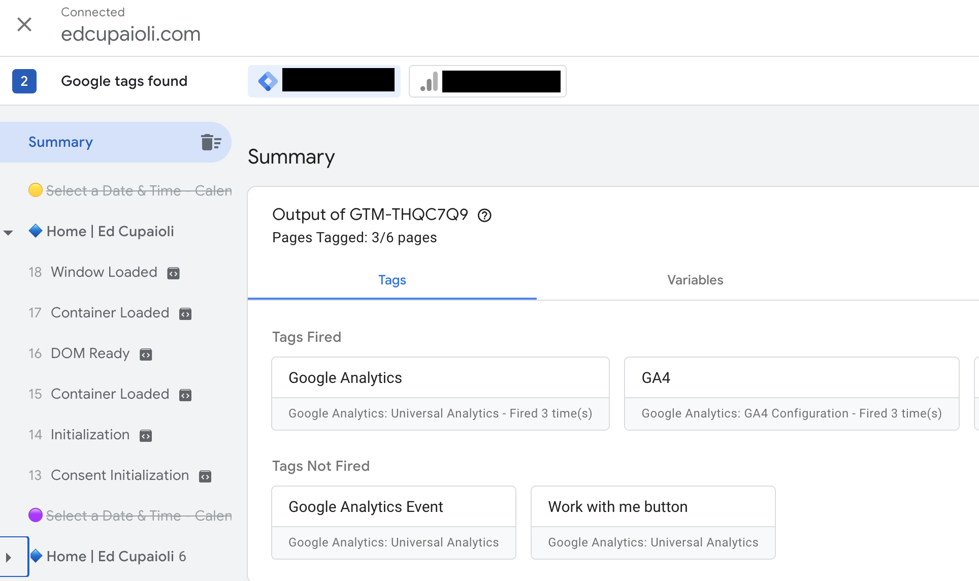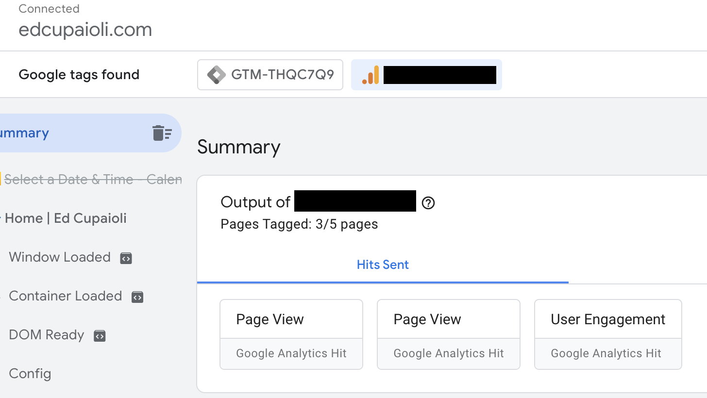 The Summary view (highlighted in blue) will show you all the tags loaded on your website. You can select each of the actions below so see what gets triggered when, but that’s more relevant for event tracking. The important thing to see is that your tag container is loaded on your website and GA4 is loading as well. I can see that GTM is connected to my site and my GA4 tag gets fired when the site loads for a page view.