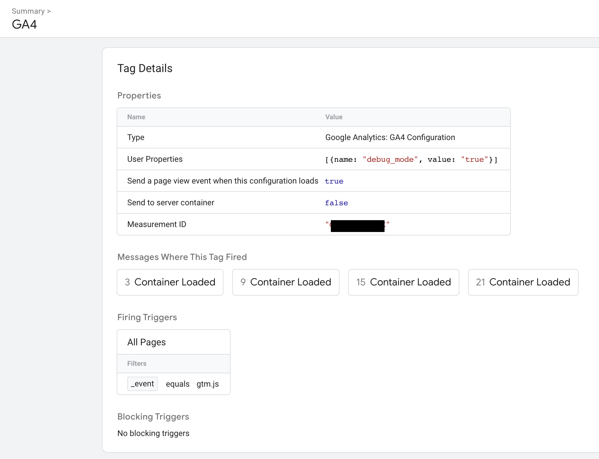 From this summary, I can see that my GA4 tag is a Google Analytics 4 Configuration that loaded with my measurement ID and debug mode parameters. You can even select each of those boxes under Messages Where This Tag Fired to see the exact moments when the GA4 tag got fired to record page views.