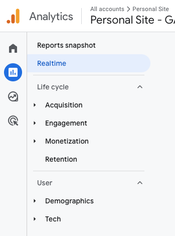 3. Once the Reports panel is open, select Realtime on the interior left-hand menu: