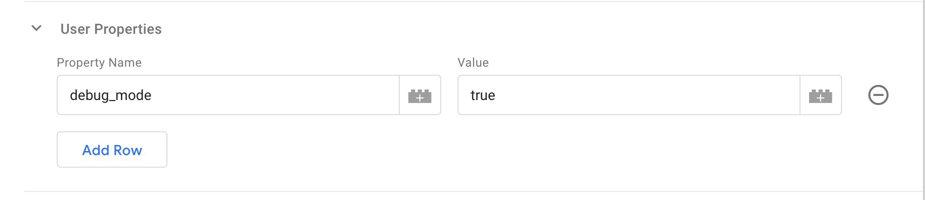11. Finally we’re going to setup the debugger so we can test our analytics configuration. Select the user properties, then type debug_mode under Property Name and type true under Value.