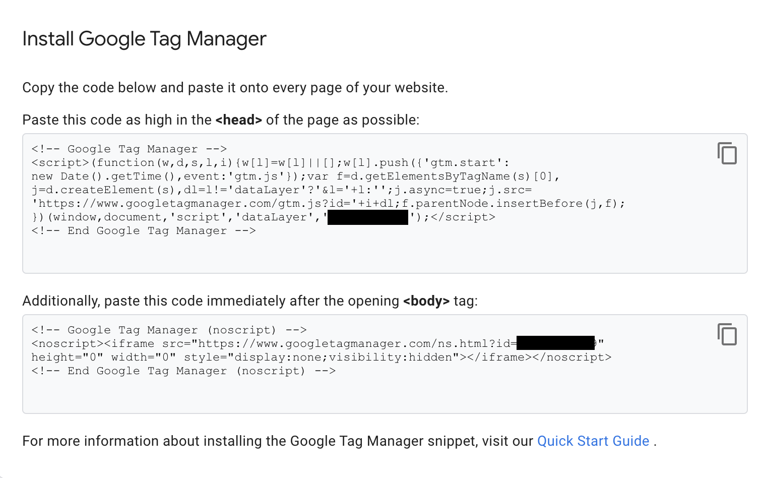 4. Now you should see two code snippets to copy. We’re going to take each of those snippets and place them at the opening of the head and body tags.