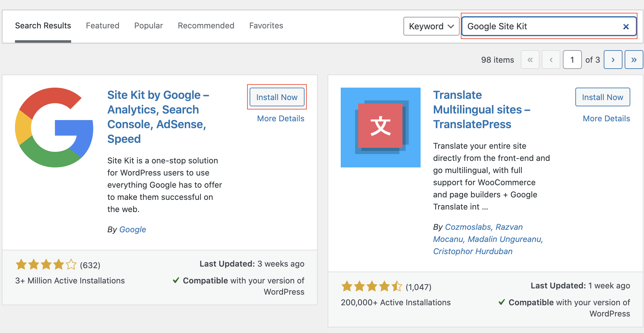 3. Type “Google Site Kit” into the search box, then select Install Now within the Google Site Kit box to install the plugin.