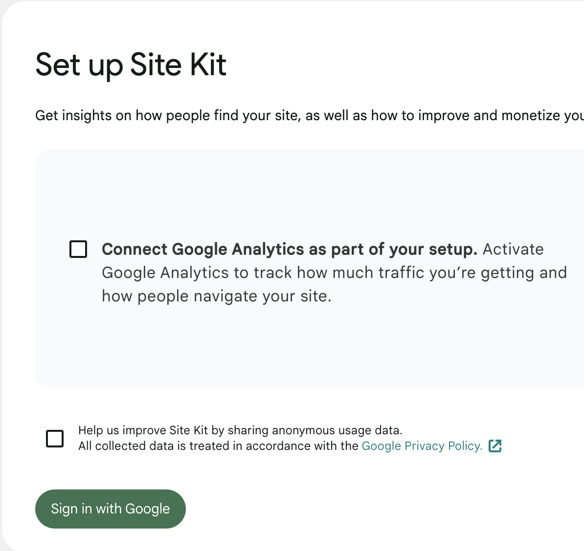 6. With the plugin open, select Sign in with Google. This will display a prompt that will allow you to login with the Google account you set up Analytics and Tag Manager with.