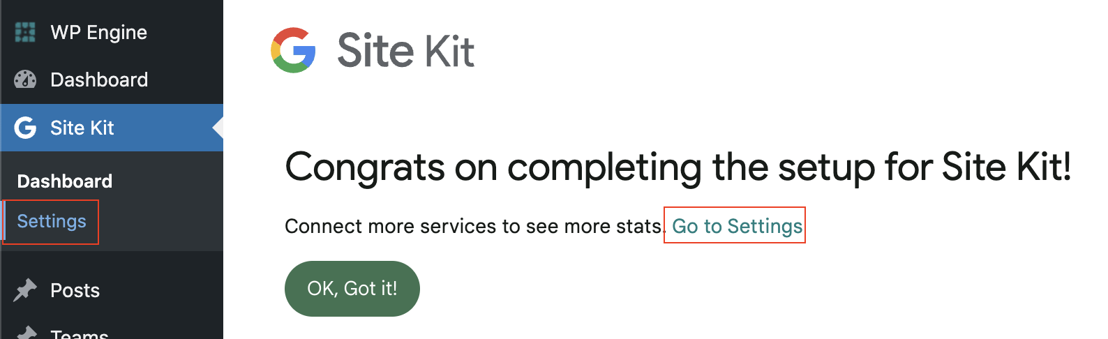 9. Once you complete the setup, you will get to access the Settings panel that will allow us to add GTM. Select Settings from the side menu of the dashboard or select Go to Settings in the success message:
