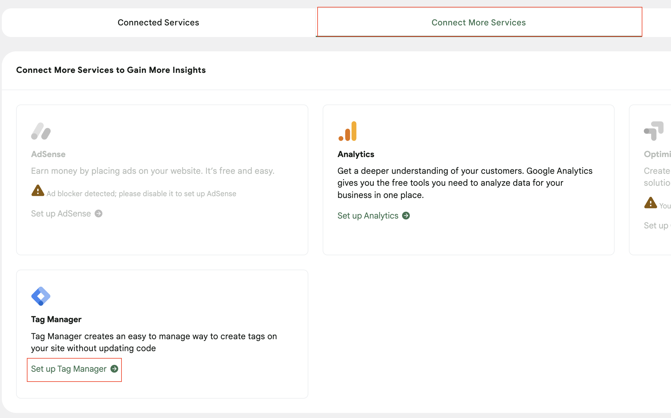 10. Select Connect More Services from the menu then select Set up Tag Manager