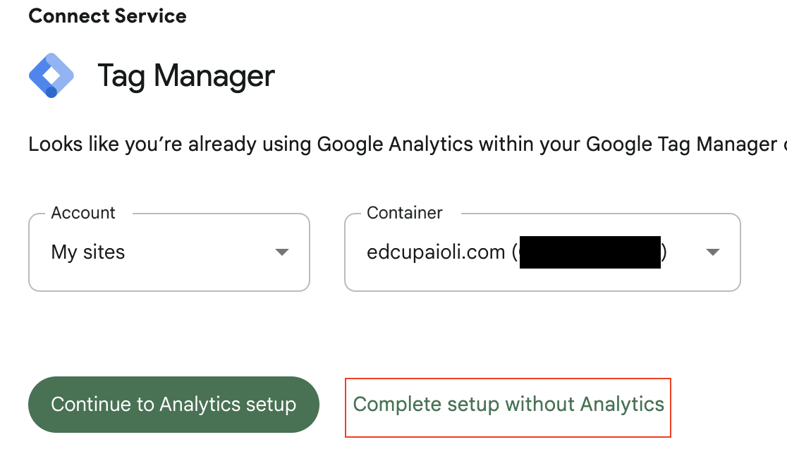 12. Select your tag manager account, then the container for your site, and finally select Complete setup without Analytics (we already set it up!).