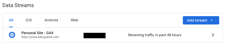 Note: If your website is not shown in the table. Select Add Stream > Web, enter your URL, add a name, then select Create stream. Google has a guide for this as well.