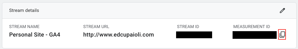 9. In the Web steam details panel, hit the copy icon (two stacked rectangles) next to your measurement ID: