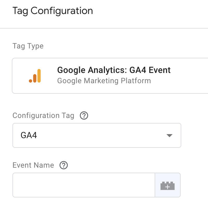 In the new model that pops up, you will select your Configuration tag (assuming you have that setup) then add your event name variable by selecting the wee lego piece: