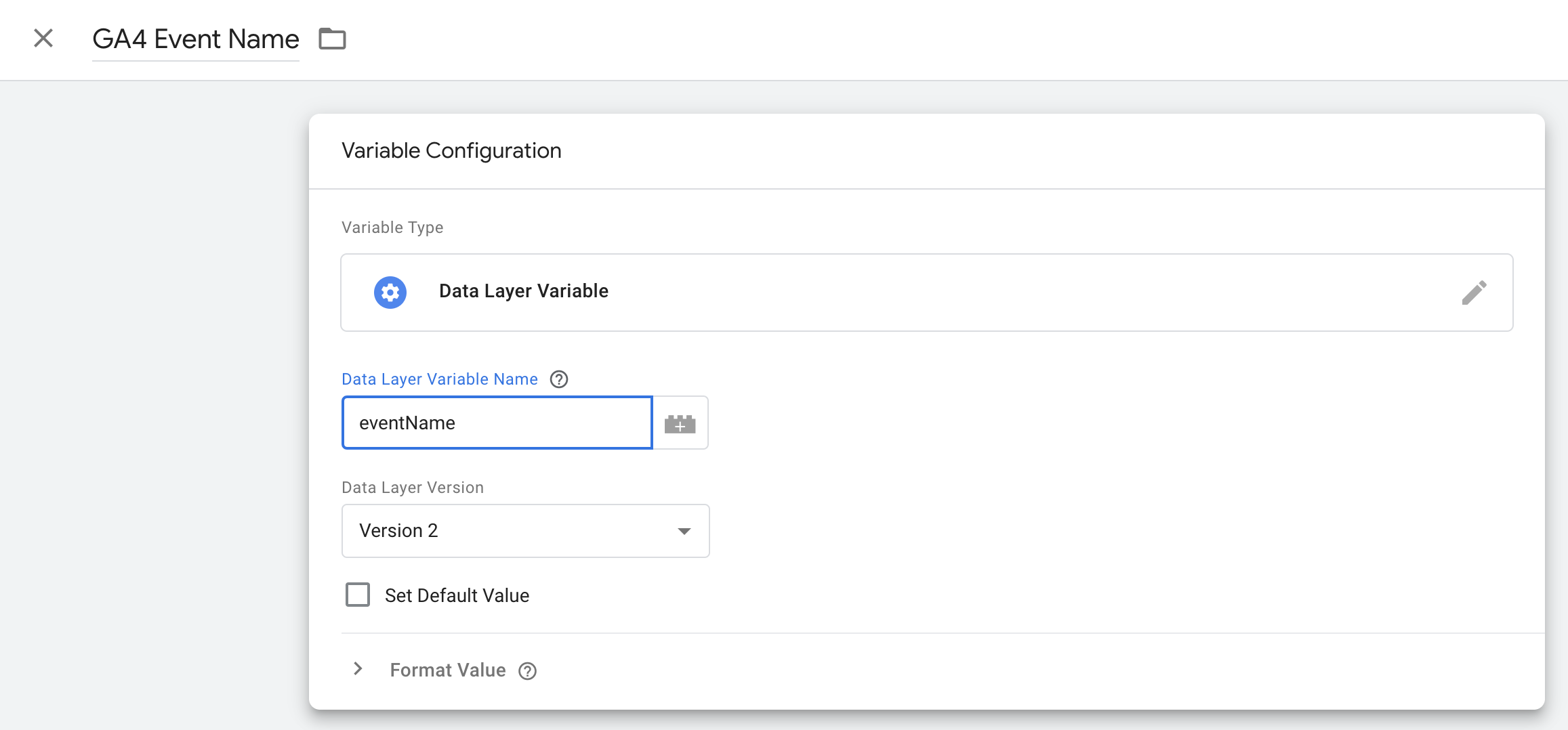 Hit save and get back to the GA4 Event Tag to see the Event Name field filled with your new variable.