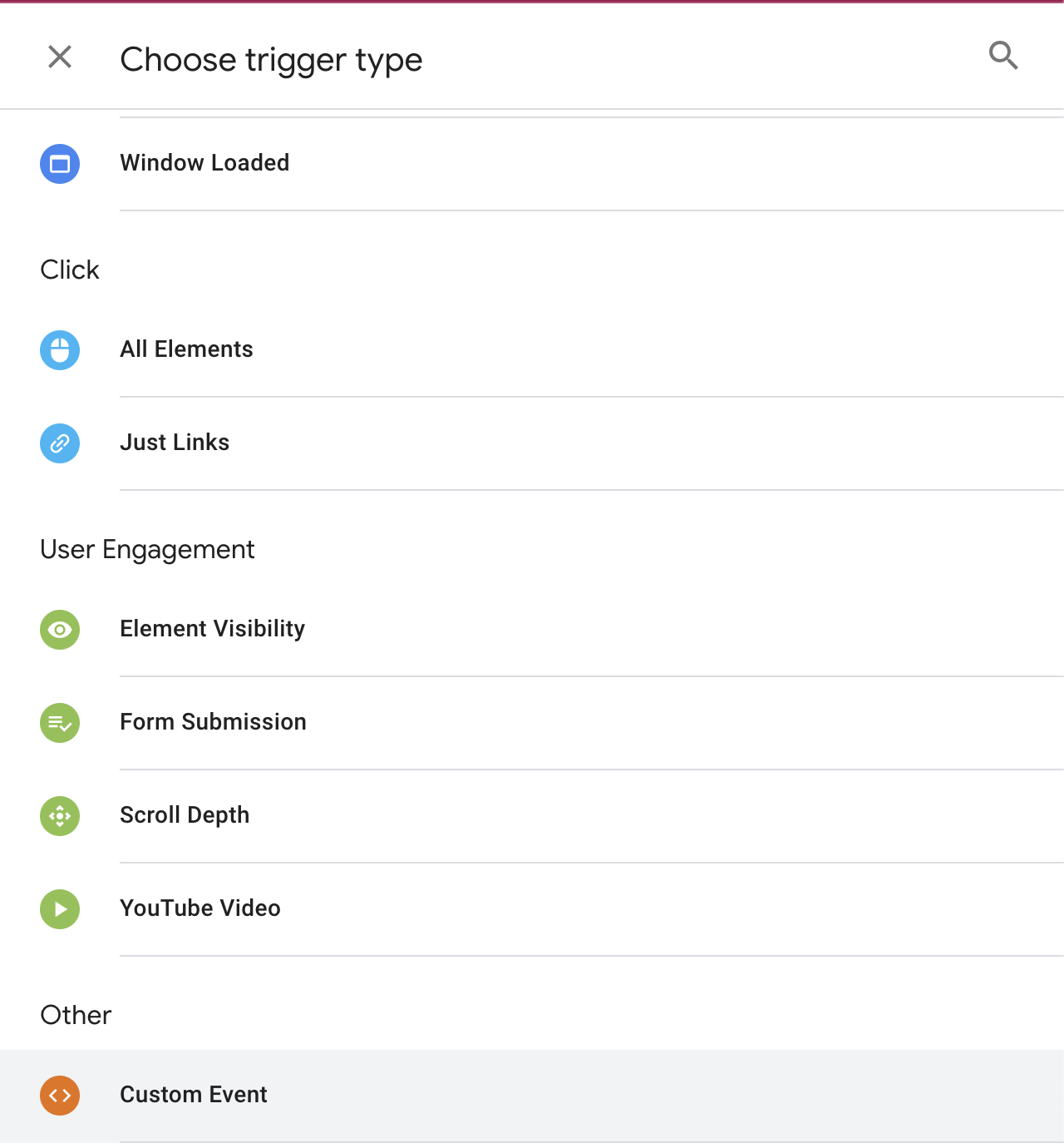 Let’s title this one GA4 Event Trigger and then select the Trigger Configuration panel to open the Choose trigger type model. Just like we did in UA, we’ll choose Custom Event:
