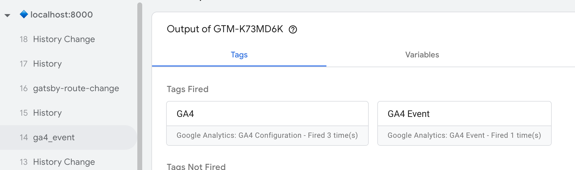 Select the preview button and enter the URL you want to test your new trigger on. You should see ga4_event in the Summary and GA4Event in the Tags Fired panel when you initiate your event: