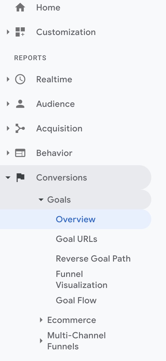 Select Conversions from the left-hand menu, then select Goals > Overview from the dropdown: