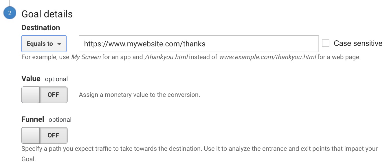Google has full documentation on all the possibilities and parameters for entering a Destination goal URL, but you are not a computer science graduate and you just want to know how many people signed up for your newsletter on a Saturday so I suggest using the full URL (example: https://www.mywebsite.com/thanks) like I demonstrated above.