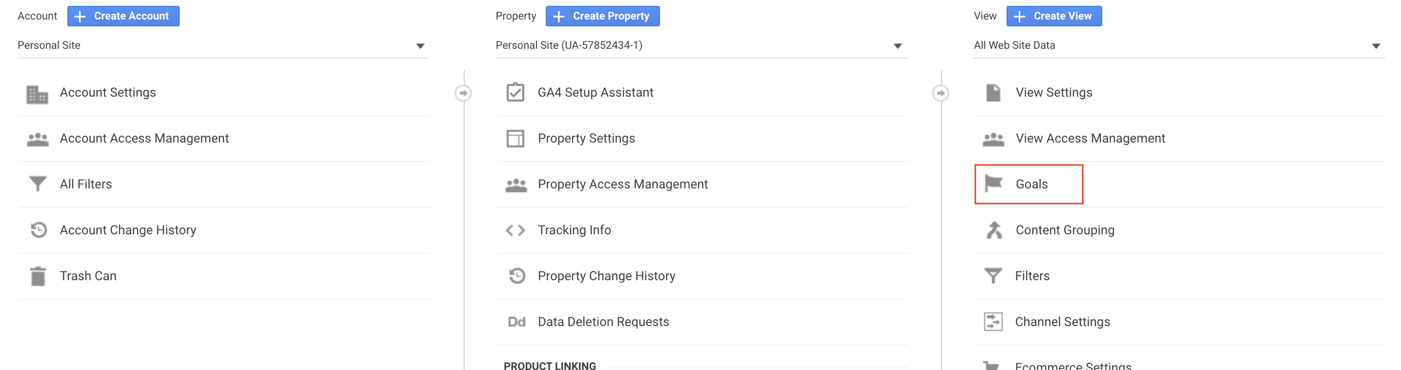 Now that you are in the Admin dashboard, select the Goals link in the View column: