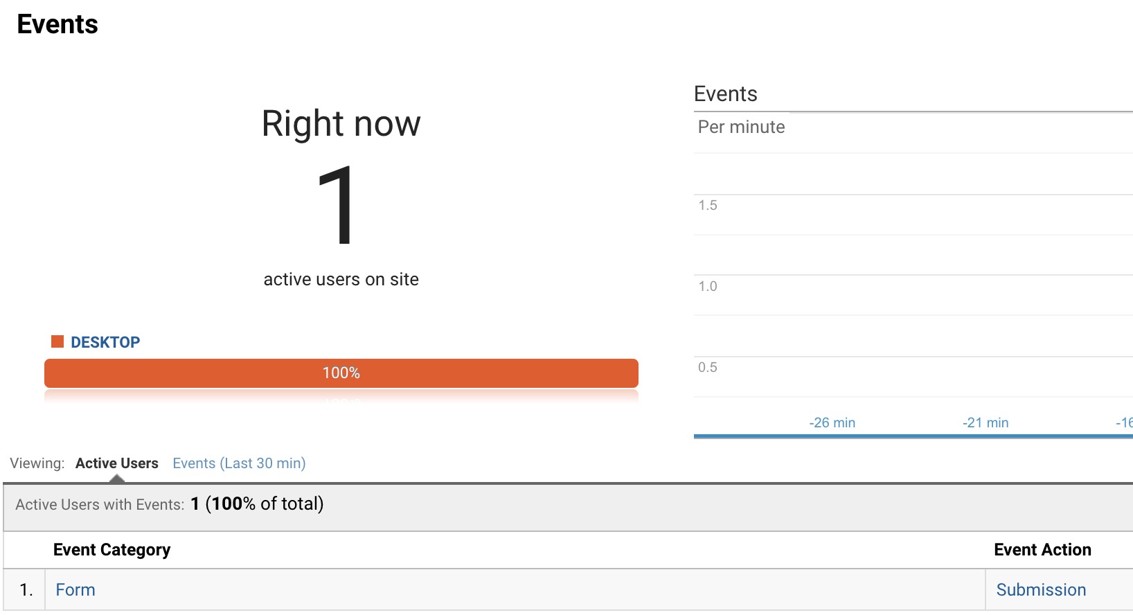 You should now see a live report of your site. You can also select Events (Last 30 min) to see what happened before.