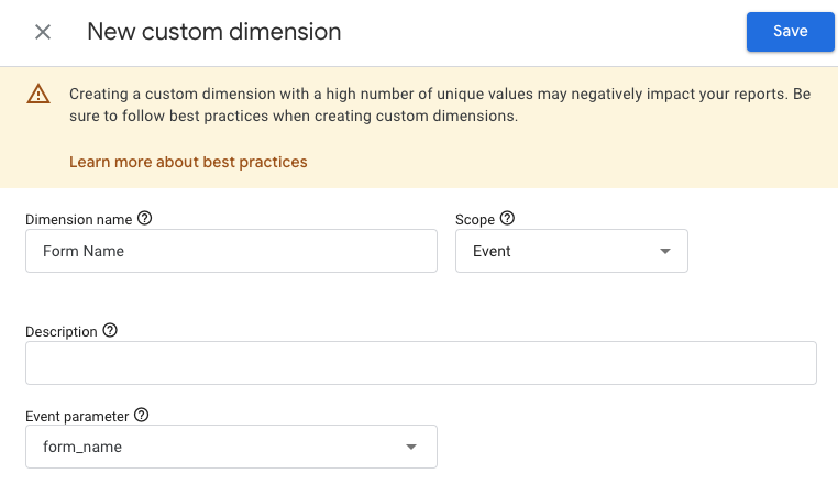 Now you’re set to add your Event Name and the Event Parameters. For the Event Name, I used the generate_lead event since Google reccomends using their recommended events and the event name is descriptive of what’s happening: a user is submitting their information for follow-up from a salesperson. That’s lead generation if I’ve ever heard of it, but feel free to use the form_submission event type from enhanced measurement, or add a new custom event. My favorite analytics blogger, Julius Fedorovicius, has a very informative article with a funny decision tree that I highly recommend reading if you’re having an existential crisis on what to name your event. For most unbounce forms, I would use generate_lead since it has a value paramter you can use to analyze your ad spend.