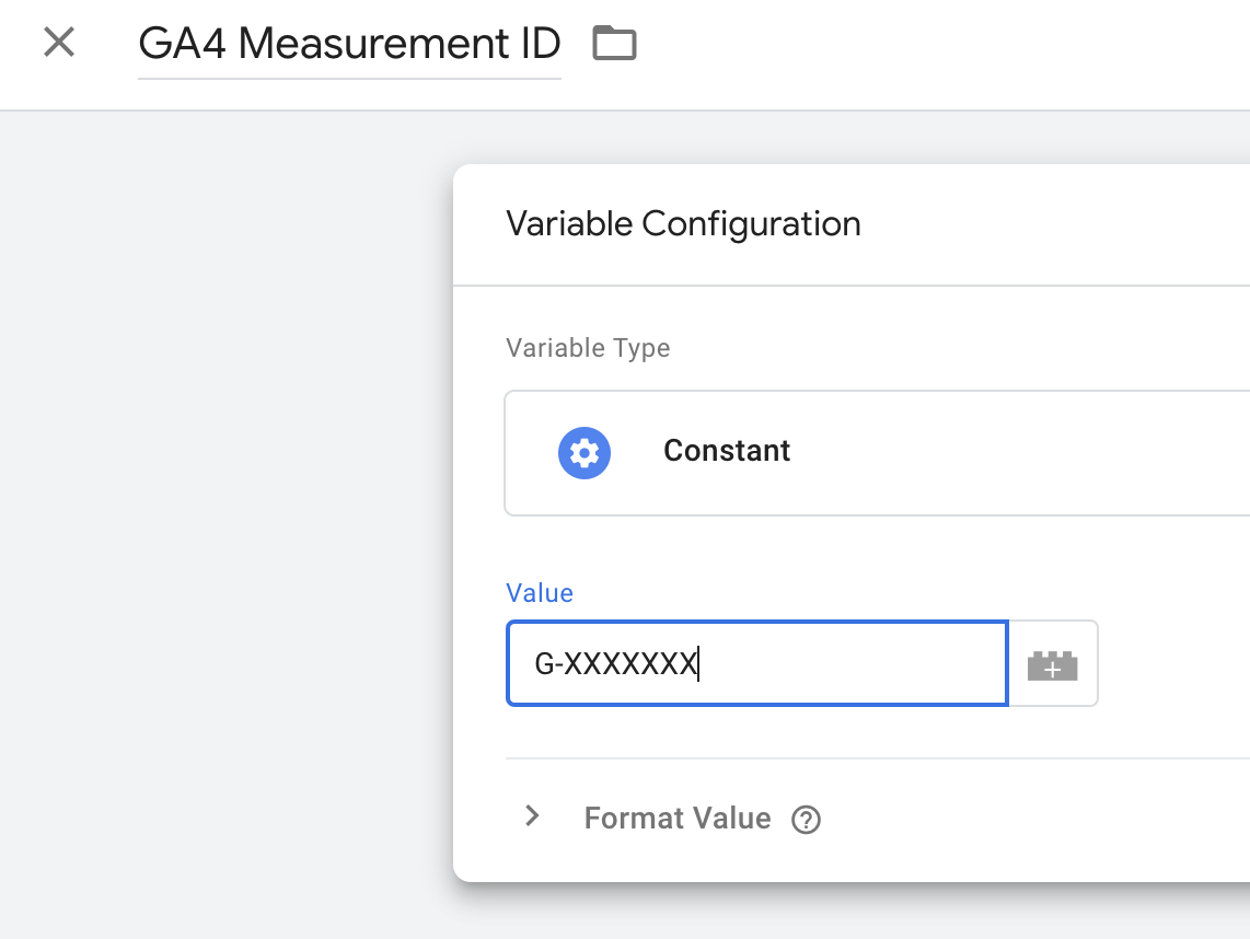 Also, to make things easier down the line, create a variable for your Measurement ID. Choose constant for the variable type and you’ll be good to go:
