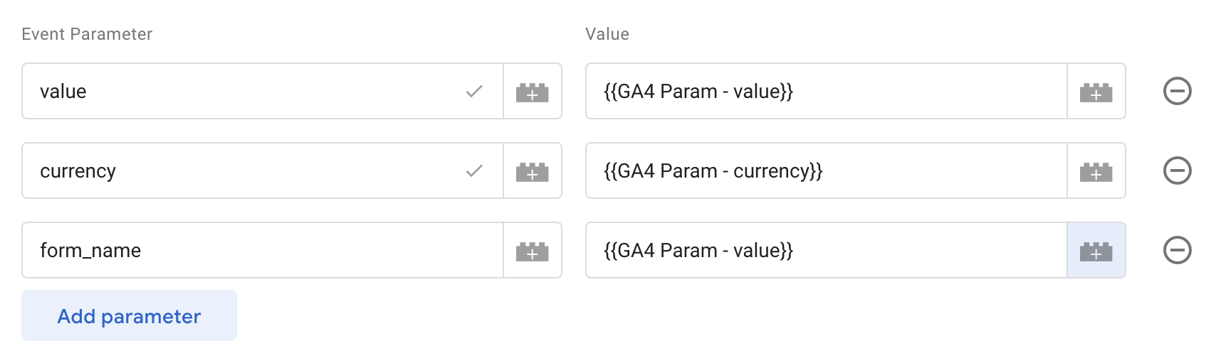 Repeat these steps for the other required parameter, currency, and our form_name parameter we’ll use to identify the form.