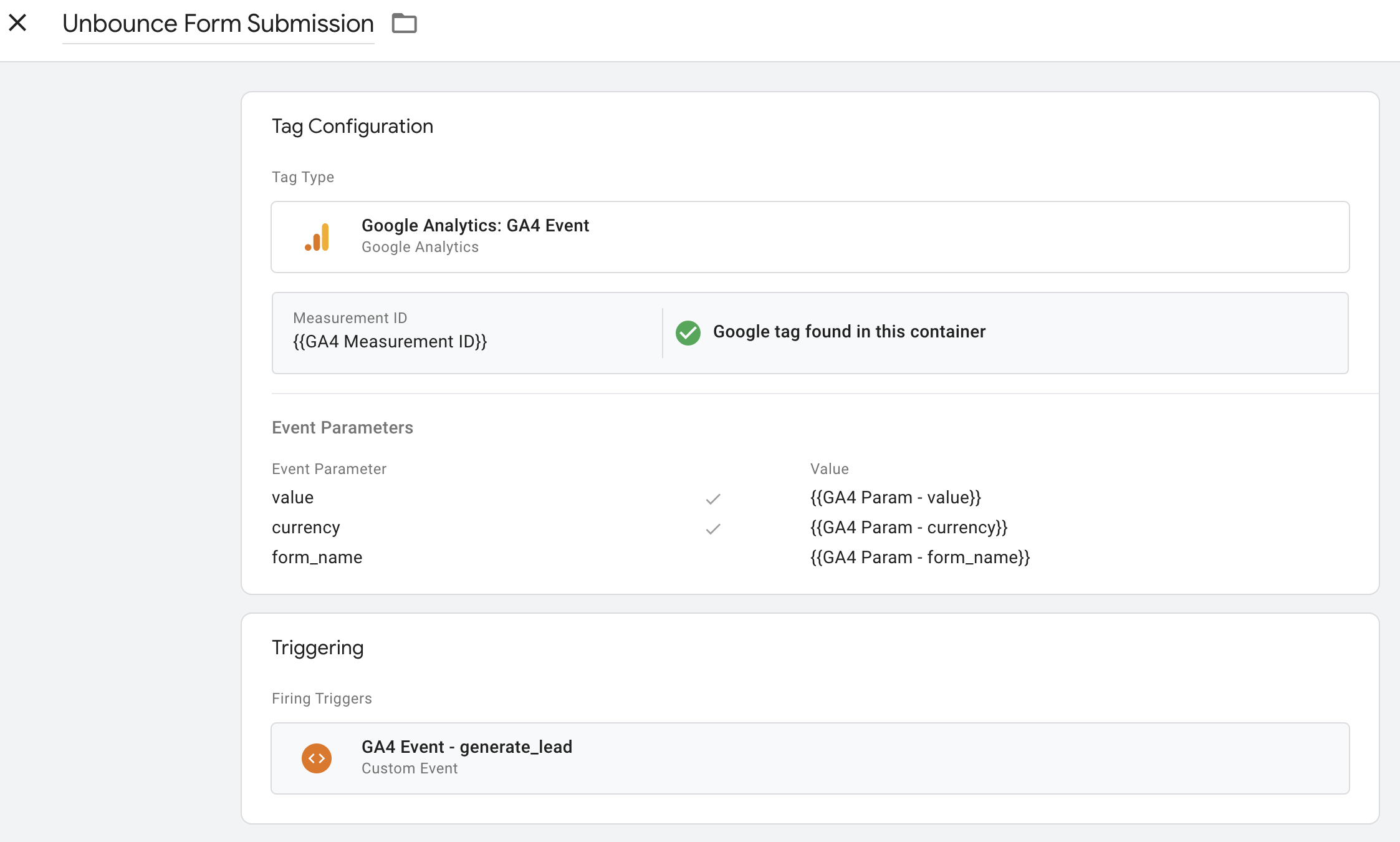 In the steps below, I will guide you on how to trigger a script on Unbounce that will tell GTM to send an event to GA4 along with the data about the form.