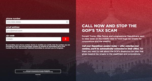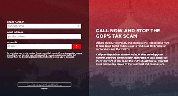 GOP Tax Scam is an action based microsite where users can enter their information in order to contact their representative in Congress. The site uses the Revere Calling tool from Revolution Messaging to call the user’s phone then connect them with their representative based on the zip code they entered. Over 4,000 calls were made in the first week of launching the site.