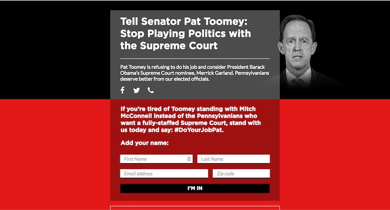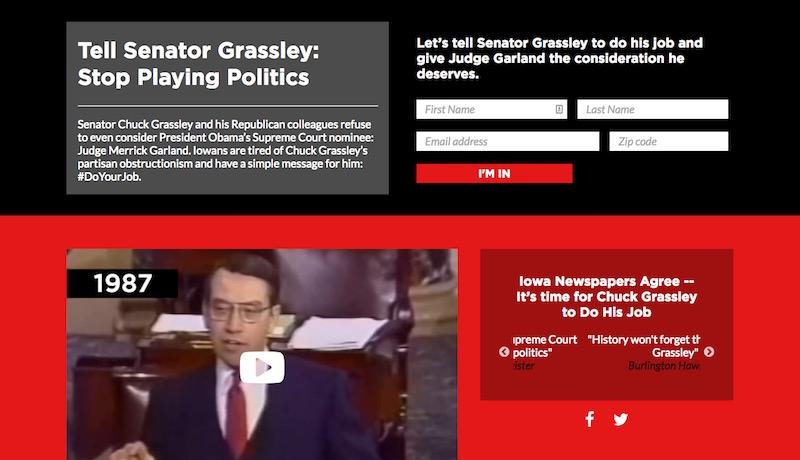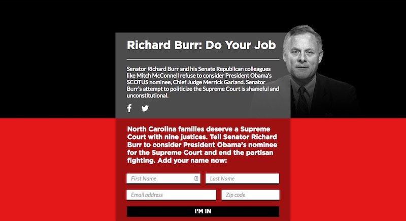 SCOTUS Confirmation is comprised of three microsites: Obstruct Chuck, Do Your Job Pat, and Do Your Job Richard Burr. I built all three sites with my rapid response template as frontends for CRM signup forms for state party engagement lists. I created a lazy load for youtube iframe on Obstruct Chuck that allows for faster page load.