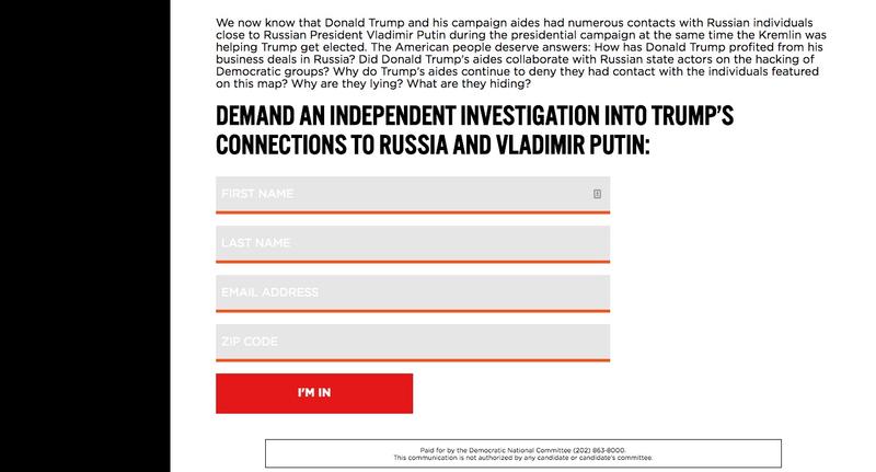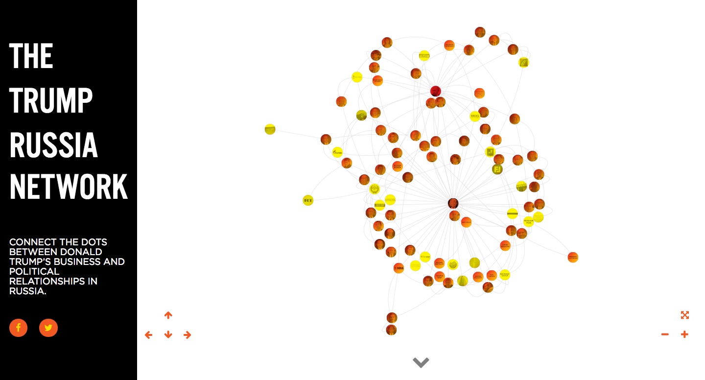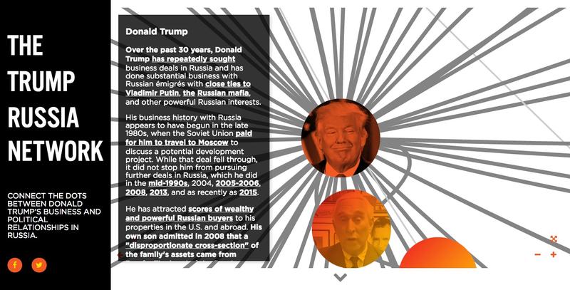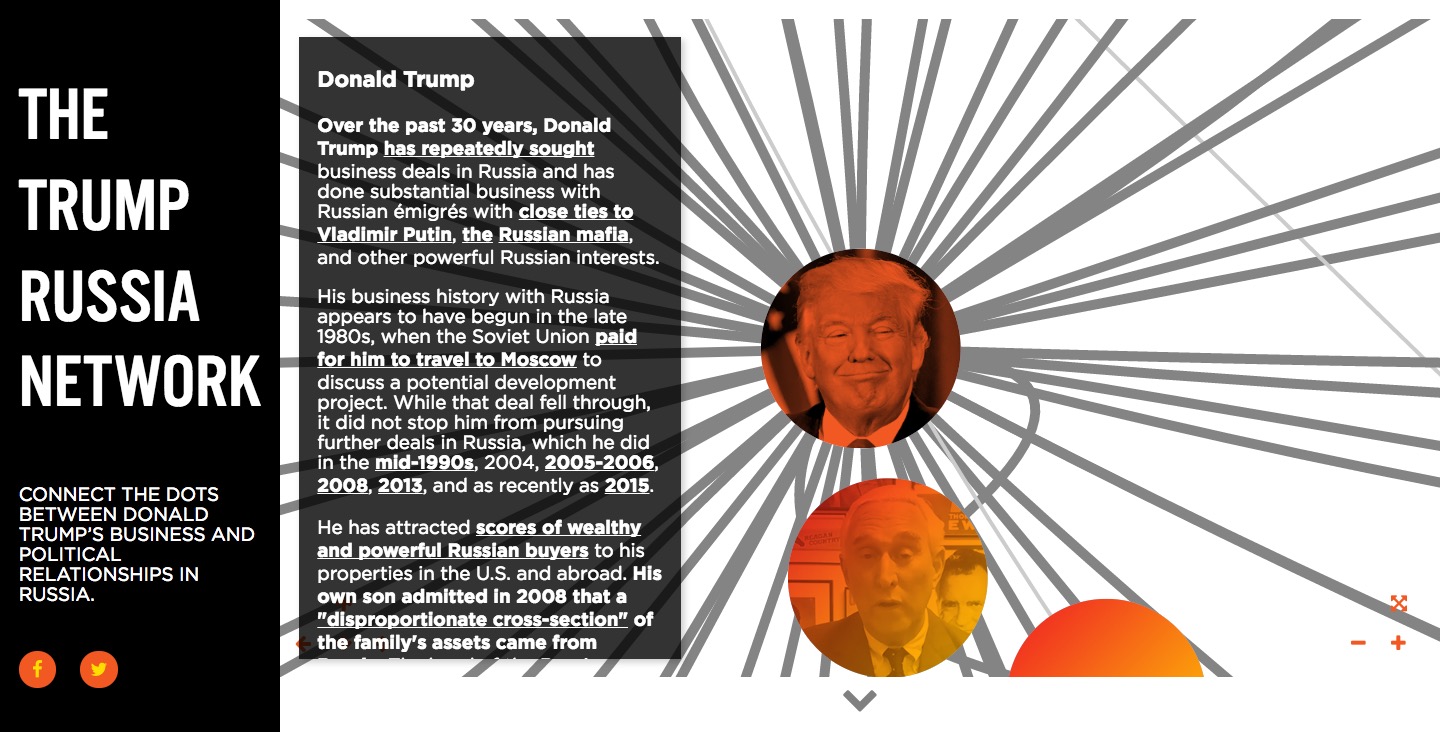 Network chart that displays the connections between Trump, his associates and the shady figures in Russia. I build this with Jekyll so that users could enter in all content nodes, then I used Vis.js to plot all of the connections.