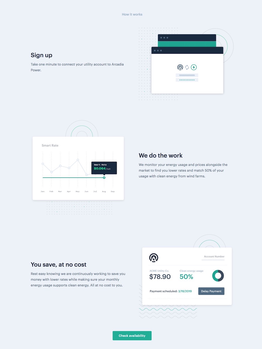 Arcadia’s mission was to realize a 100% renewable energy grid through connecting consumers to renewable energy via their current utility. The problem was that most people didn’t know what brokerage, renewable energy credits (RECs), or community solar was and the subjects themselves were quite complex. Through some research and many other experiments, I found the best way to explain Arcadia was just to explain how to get connected to our service.
